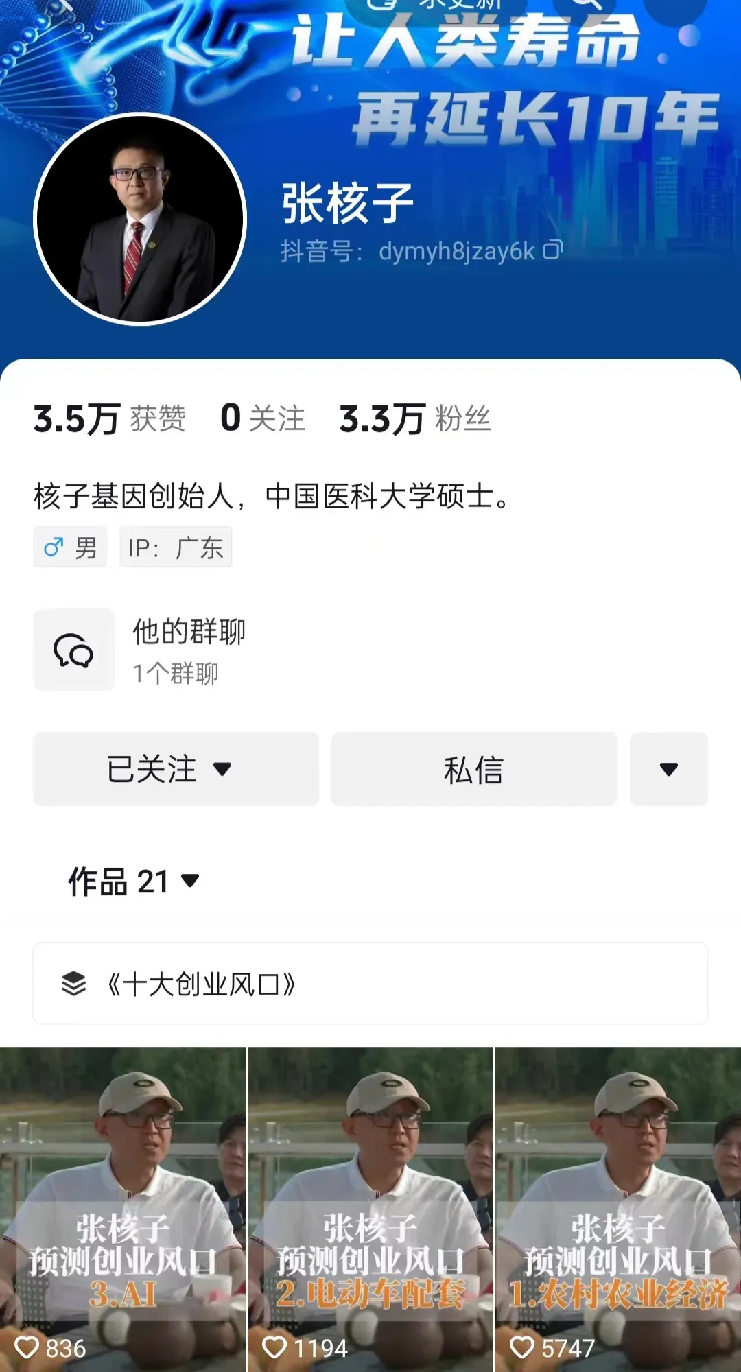 经过一个月左右的“身份”辟谣后,4月中旬,镜头里的张核子人设又发生变化,似乎成了帮人看清未来、指点财富迷津的老朋友。