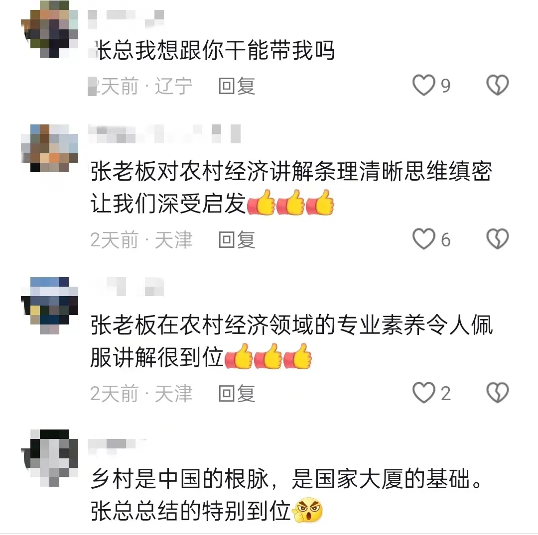 他的这条视频获得5千多点赞,有粉丝评论称“张总我想跟你干能带我吗”“张老板对农村经济讲解条理清晰思维缜密让我们深受启发”,也有人认真讨论“虽然我是搞农业的,我也有粗加工的能力,但是卖不出去咋办?年年种的蘑菇都要倒掉好多,我最愁的就是销路。”有人拆台“你说的这些十年前我就在做,亏得现在还在打工还钱”,还有人调侃道:“张总下一期双色球开什么号码”“给我们分享一下中标经验吧”。