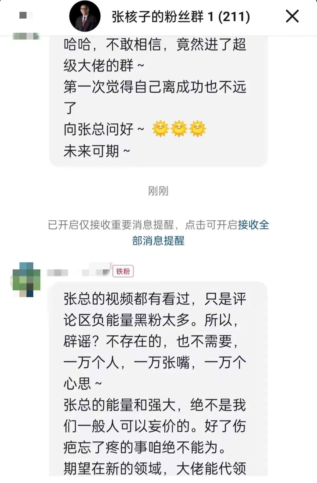 目前,已经有两百多人加入了张核子的粉丝群,有人在群中兴奋地表示:“不敢相信,竟然进了超级大佬的群,第一次觉得自己离成功也不远了”。张核子在过去十余年频繁更换赛道,赚得盆满钵满之余,塑造的“成功商人”形象会带领粉丝们走上共同致富吗?