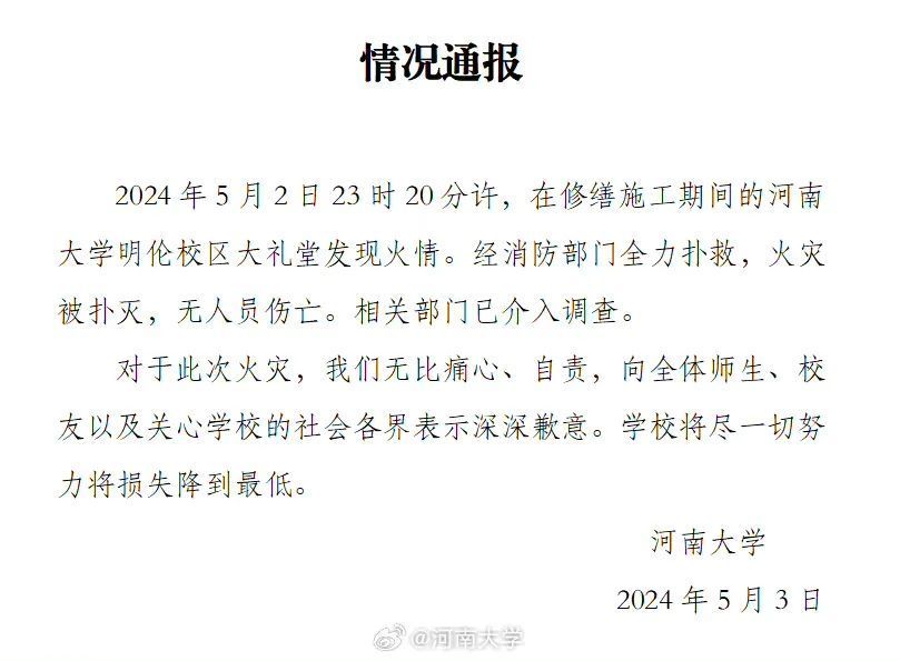 3日早上8时08分,河南大学官方微博发布情况通报。通报表示,发现火情的时间为5月2日23时20分许,起火的大礼堂正在修缮施工期间。火被扑灭,无人员伤亡。
