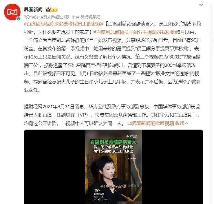 引起最大争议的一条标题是这样的:“百度副总裁璩静谈管人 员工闹分手提离职我秒批 为什么要考虑员工的家庭”。