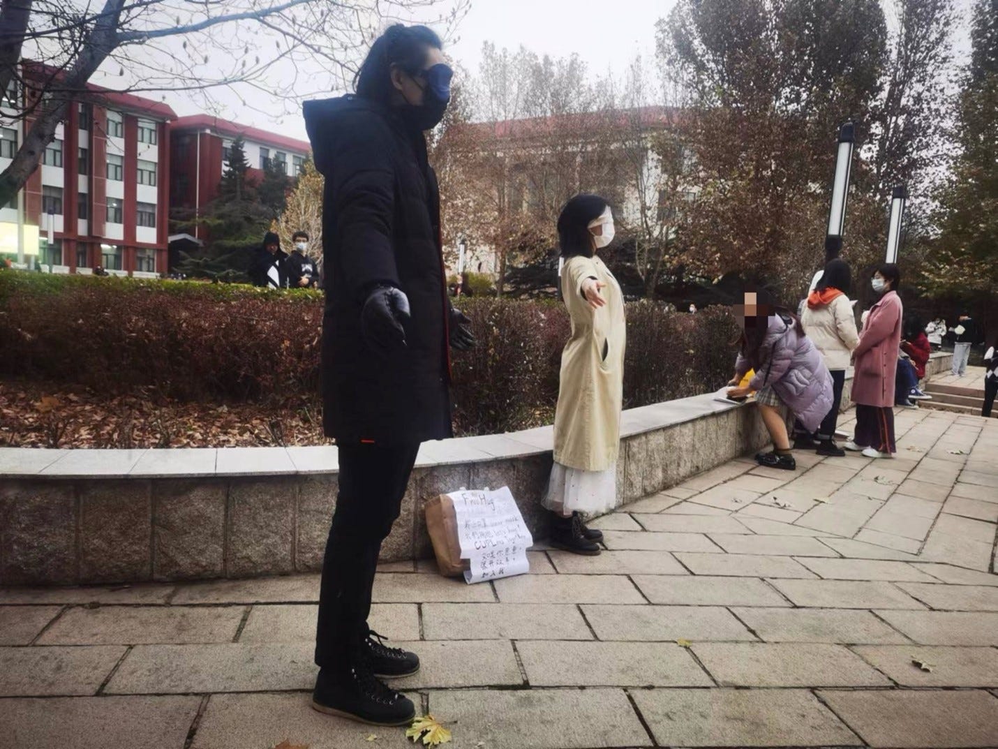 在抗议发生的同时,教学楼前的小花园里有学生发起了free hug活动。他们用眼罩和口罩蒙住眼睛和嘴巴,张开双手,邀请感到压抑的同学们上前拥抱。公安最后没有抓人,星野也没听说有同学受到处分。没两天,星野听到宿舍楼对面的食堂有“咔咔”的声音,桌子和凳子又被搬回去了。他心疼食堂师傅的辛苦,“这种体力活来回干还没什么意义,学校领导也不会因为这个给他们加工资。”