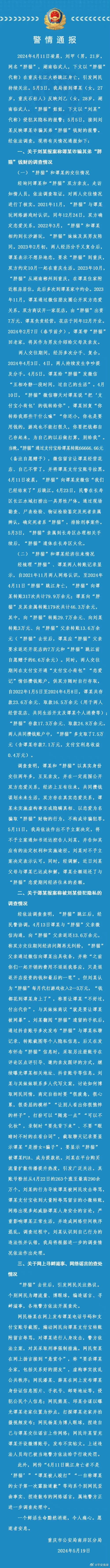 5月19日晚,重庆南岸警方通报“胖猫”跳江身亡事件的详情。