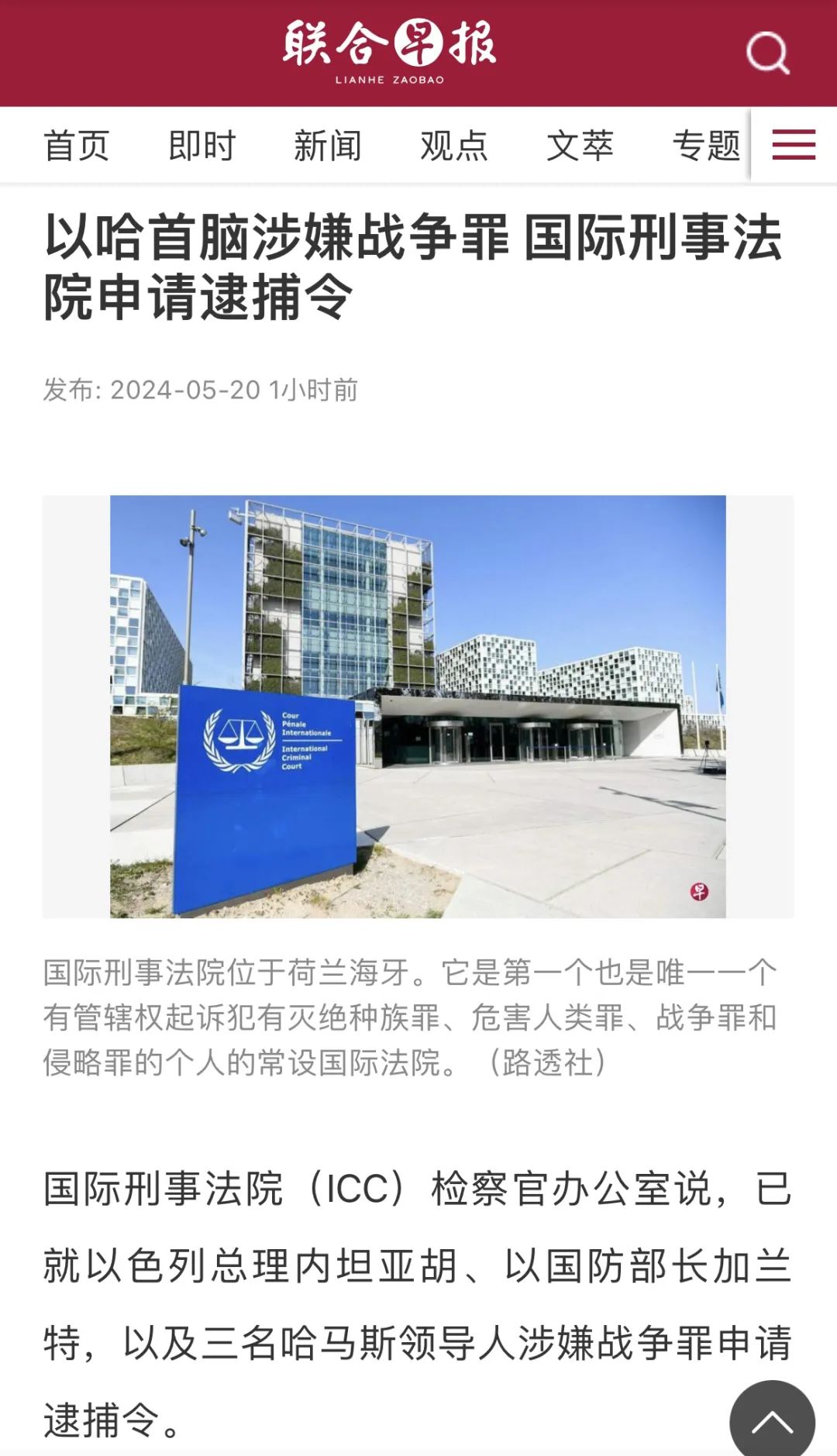 第二张是联合早报的报道,以色列总理、国防部长2人,还有哈马斯3名领导人涉嫌战争罪被国际刑事法院一名检察官申请逮捕令。