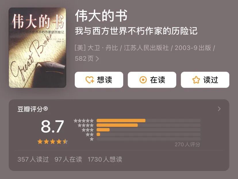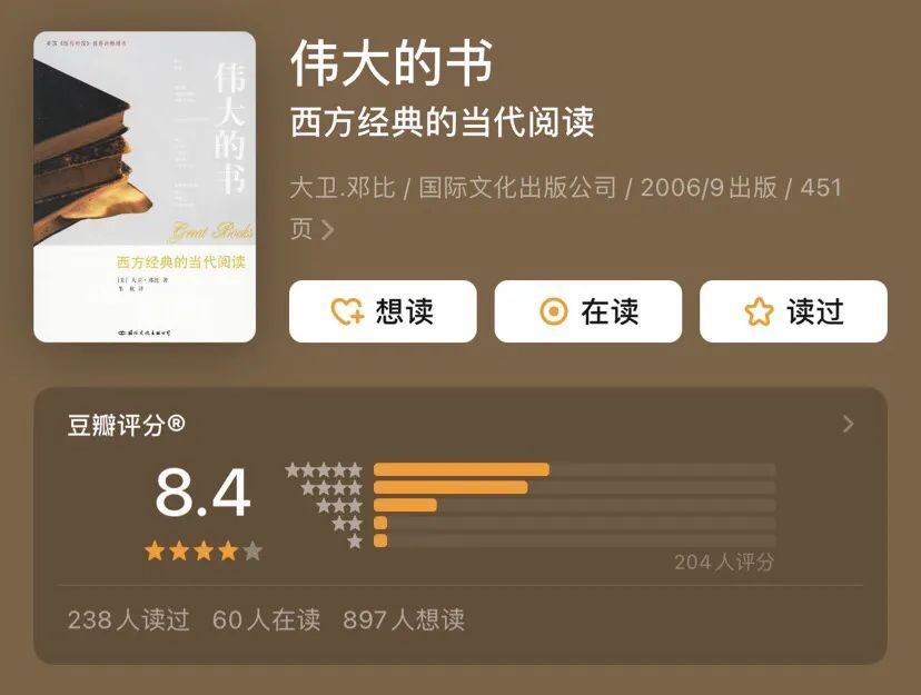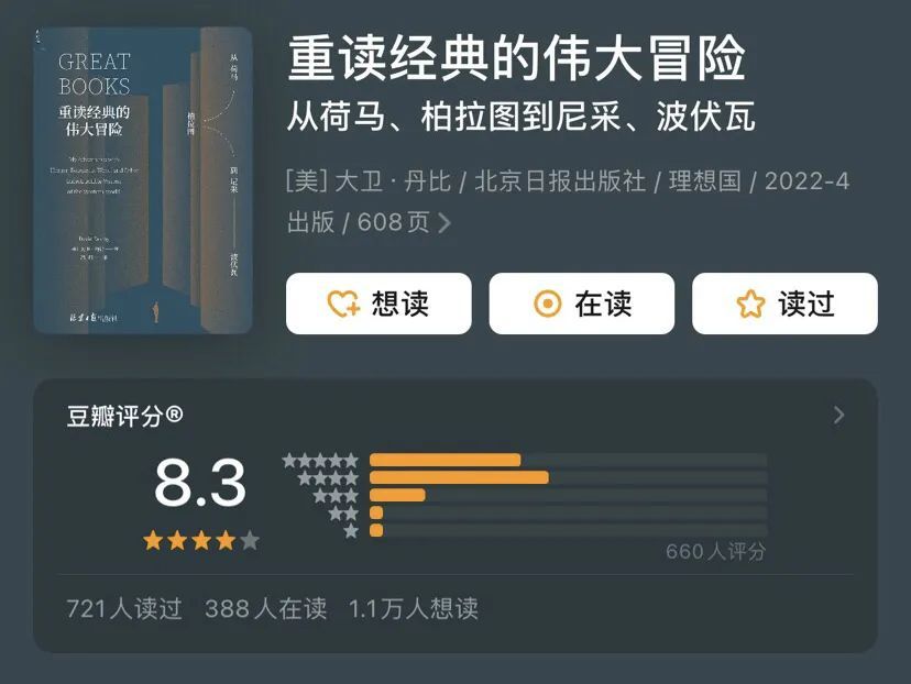 《重读经典的伟大冒险》, (美)大卫·丹比(David Denby),北京日报出版社,2022年4月。原版中的马克思和穆勒这一节(第二十四章)内容全部删掉,只剩三页。该书有江苏人民出版社2003版和国际文化出版公司2006版,书名《伟大的书》。2003版有马克思部分,2006版删除马克思部分。延伸阅读点击👉《有点尴尬的马克思》。