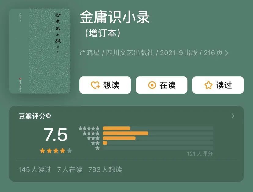 严晓星《金庸识小录》,有中华书局2012年版和四川文艺社2021版。2021新版把2012旧版拆成了两本书,旧版附录的《金庸年谱简编》增订单独成书,同时也有删减。延伸阅读点击👉《有关金庸作品的删减》。