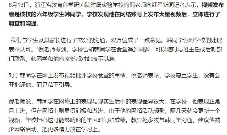关于韩同学发网络视频批评学校食堂的事,学校一位倪姓老师跟记者说:“我们与学生及其家长进行了充分的沟通,双方达成了一致意见。韩同学也对学校的处理表示认可。”同时表示,“学校尊重学生,没有公开批评他,而是私下引导。”