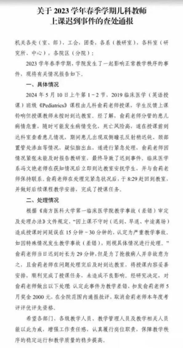 南方医科大学第一临床医学院对此事的查处通报