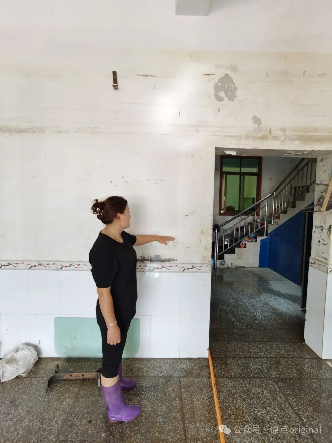 兴教街居民手的位置是2017年时的涨水位置。这一次涨水完全超出了她的预想,家里一楼几乎全部淹了。郑子愚/摄