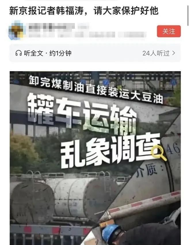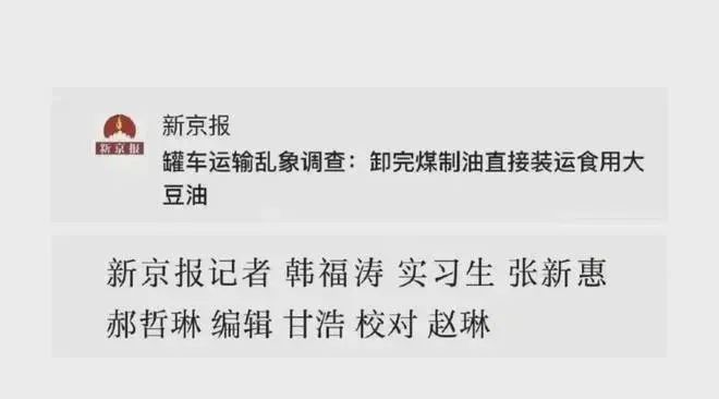 曝光油罐车装完工业油未经清洗直接装食用油之后,新京报和新京报的记者韩福涛受到了高度的关注。