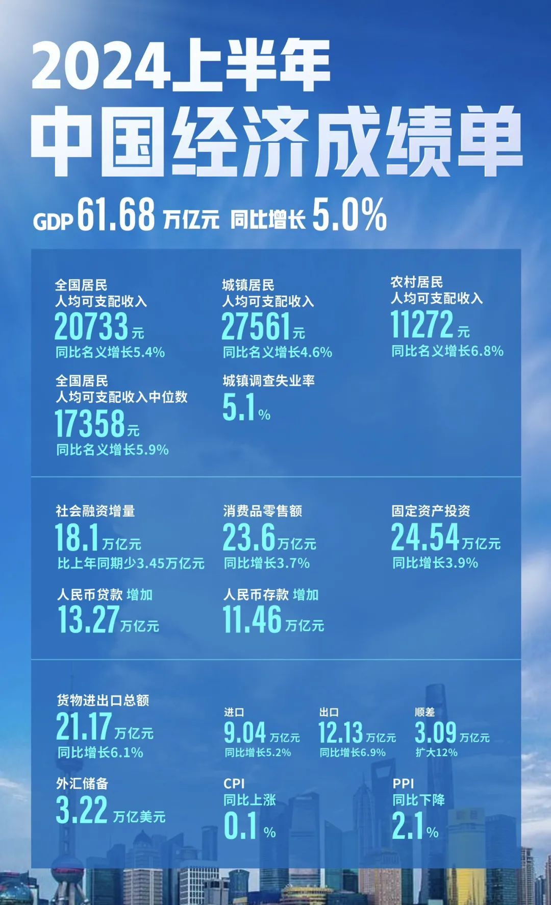 据国家统计局发布的权威真实硬核数据,上半年,全国居民人均可支配收入20733元,同比名义增长5.4%,扣除价格因素实际增长5.3%。