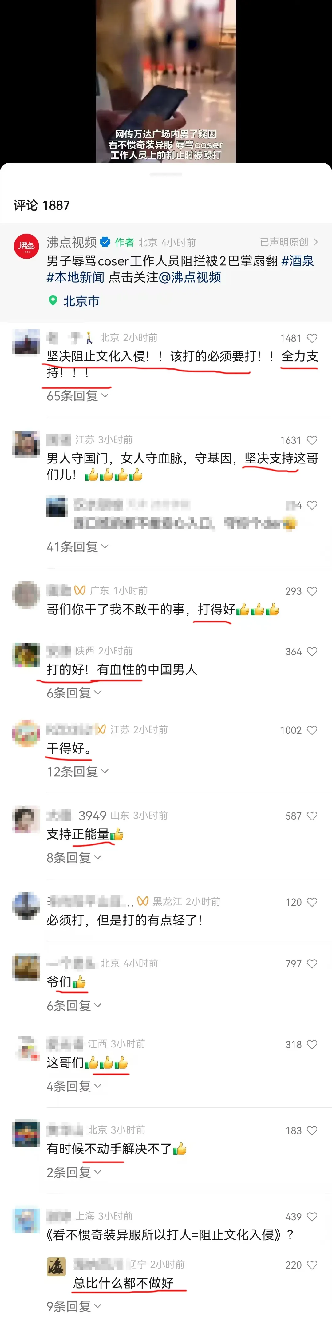 一虎背熊腰的中年男人,情绪激动地辱骂COSER,并把人打得满地血点子。