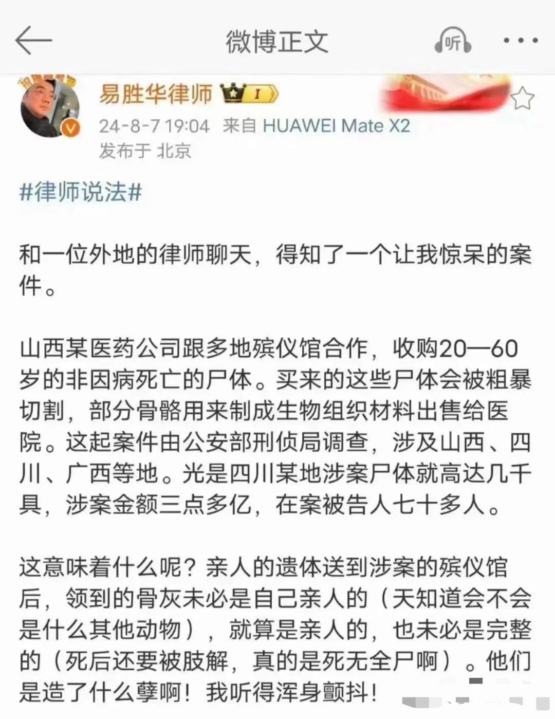 据流传出来的公安部门《起诉意见书》显示,2015年1月到2023年7月,山西奥瑞生物材料有限公司涉嫌非法购买遗体、残肢作为原材料,并在购买和生产过程中对非法获取的尸体、尸骨进行粗暴肢解、剔除皮肉、清洗、辐照等,用于生产“同种异体骨植入性材料”产品,营业收入合计达到3.8亿元。