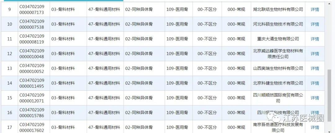 查询得知,中国持有“同种异体骨”注册证的生产企业共有17家:
