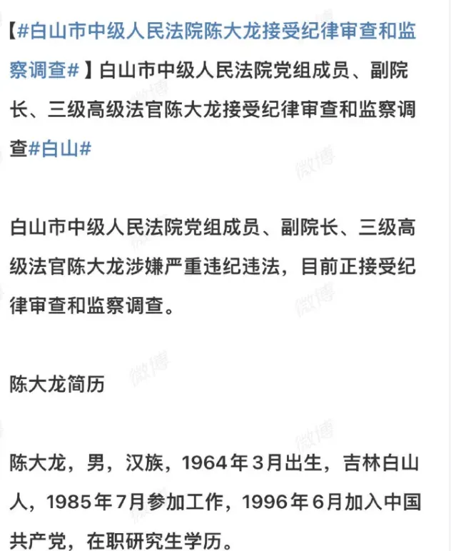 吉林省白山市中级人民法院党组成员、副院长陈大龙上网喊冤,说自己是28年党龄、37年工龄的老法官,要维护党纪国法的尊严。