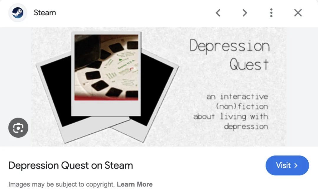 2013年末,独立游戏开发者Quinn发布了一款以文字为主的游戏《抑郁自白》,旨在通过一系列虚拟场景来传达抑郁体验,部分内容和设定是基于Quinn本人的抑郁经历。