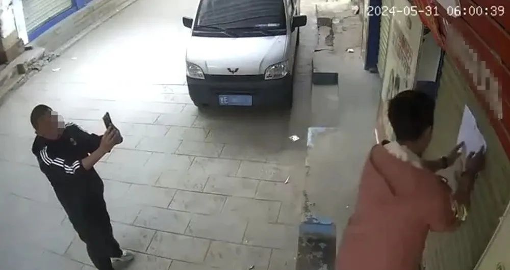 为了进一步证明烟草局伪造证据,律师们又查了周边监控,发现2024年5月29日、31日清晨,各有两名工作人员多次在该店铺广告牌、卷帘门等处张贴文书,拍完照又把张贴的文书撕下带走,伪造送达过程。其中,烟草局工作人员2024年5月31日清晨6点拍摄的照片,正是烟草局提交卷宗中的所谓2021年送达的照片。