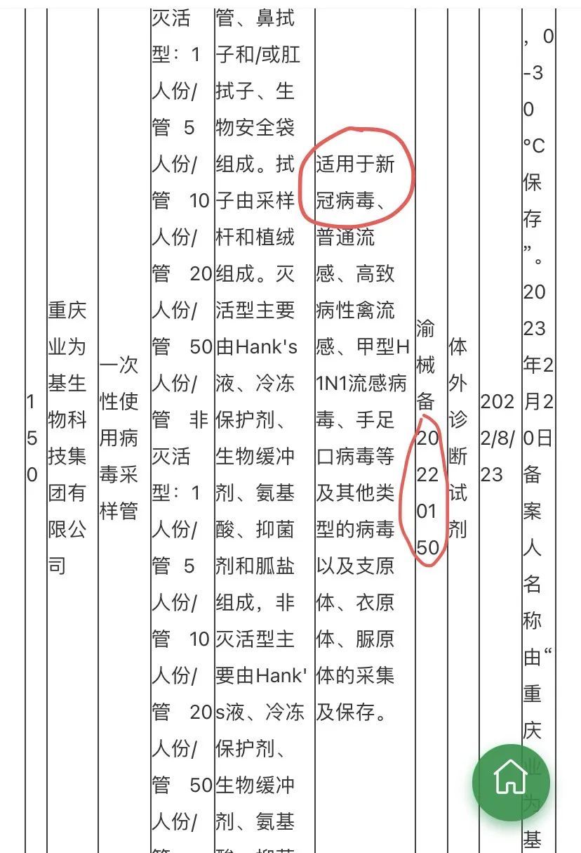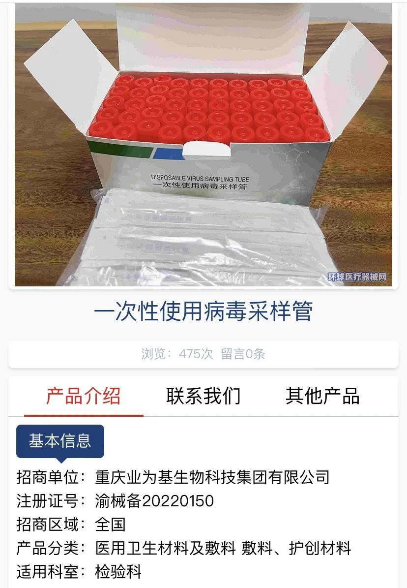 根据采样管上模糊的“监械生产备20220150号”,我多番搜索比对,初步确定是重庆业为基生物科技集团有限公司生产销售的一次性病毒采样管。