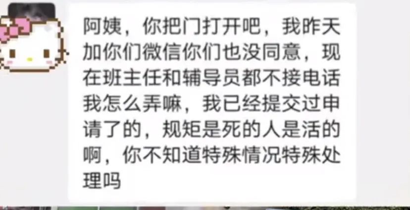 然而跪下也没用,亲人去世了也没用,拿着请假条也没用,宿管的意思就是没有领导通知她不能破例开门。