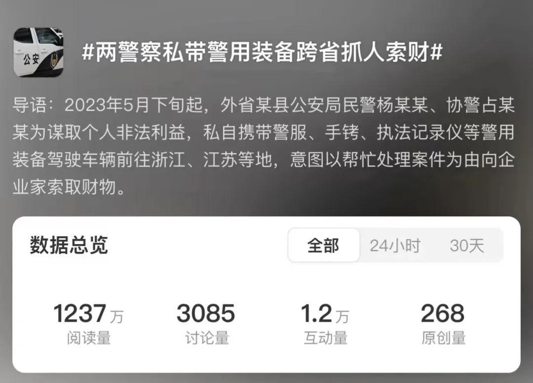 最近,#两警察私带警用装备跨省抓人索财#话题登上微博热搜。