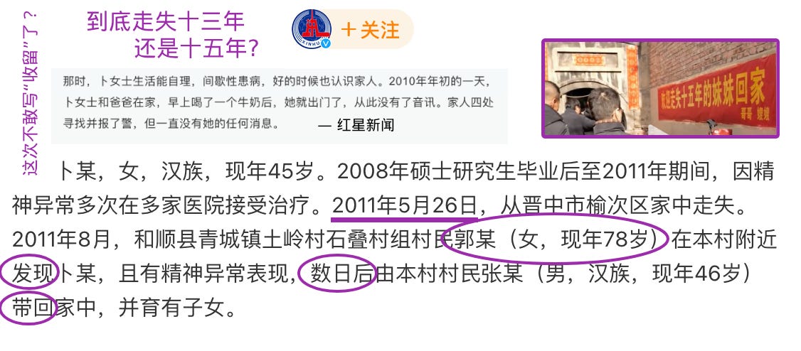 其次,通报中突然冒出来的78岁女村民郭某,在事件中扮演了什么角色,相当可疑,但通报坚称“尚未发现卜某被拐卖的线索和证据”。从2011年8月“郭某在本村附近发现卜某”,到“数日后由张某带回家中,并育有子女”,三句话的时间点和逻辑非常跳跃。