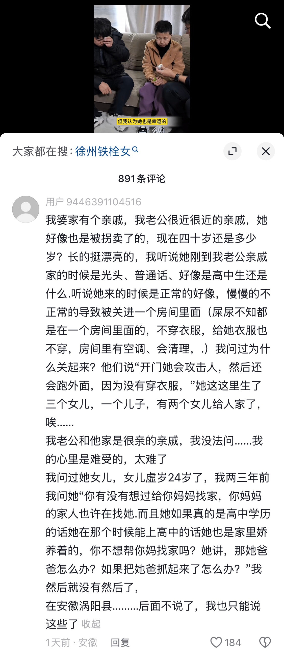 更重要的是,早前张某侄女已经在直播中爆料过,卜女士到张家之前,曾在村子的桥洞里,被一群光棍强暴。而大皖新闻记者在村里实地探访时,曾从村民处听说,最初将花花带回村的是村里另一位老人,当记者找到他时,他连连推说“不知道”让记者找其他人。请问警方排除这位男村民的嫌疑了吗?这三人是何关系?你们确定只有一位强奸嫌犯吗?