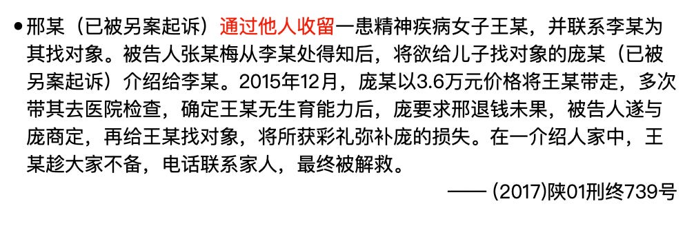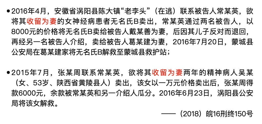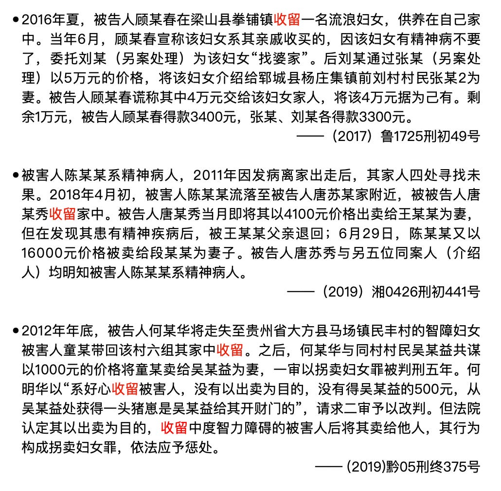 看看裁判文书网上收录的拐卖精障妇女的案例,不乏精障妇女先被“收留为妻”,剥削完性价值后,再被“丈夫”转手卖人,获得剩余的经济价值。说是“用后即弃”也不为过。