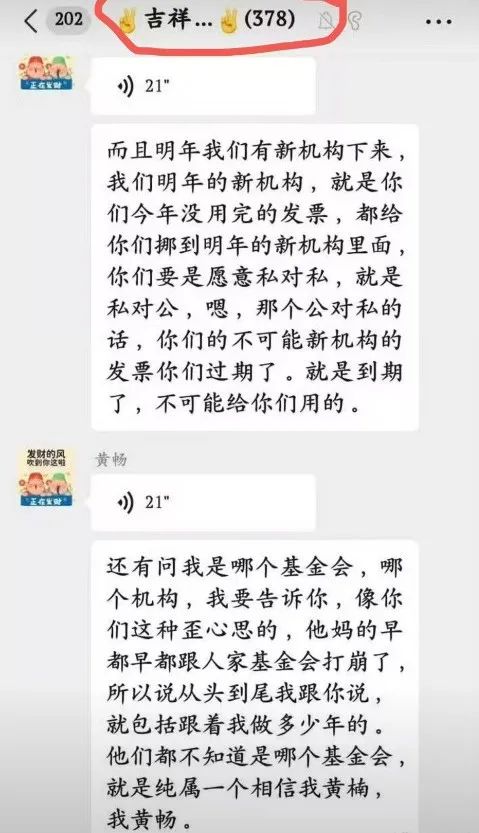 但直到现在真正吃了亏,人们回想起来才会察觉到端倪。与公益机构一般采用对公账号进行转账不同,最初做项目的时候,黄南让病友将钱转到了孟祥龙和吕子鑫的个人账户上。黄南曾在群里解释,“孟祥龙是基金会的财务,吕子鑫是基金会的法人。”