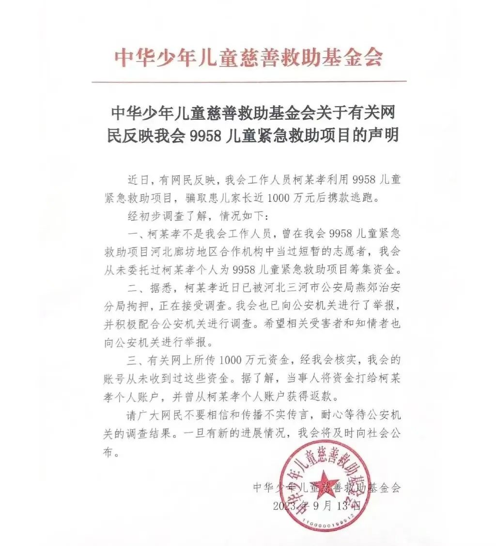 相关乱象直到2023年9月得到了大量曝光,中华少年儿童慈善救助基金会项目四部9958廊坊团队主任柯善孝以配捐为名,涉嫌向患病儿童家长筹集资金,骗取了上千万元。事情被揭发后,柯善孝被移送司法机关处理。从此,以“配捐”为名的资金操作,开始得到监管部门、相关平台的重视。