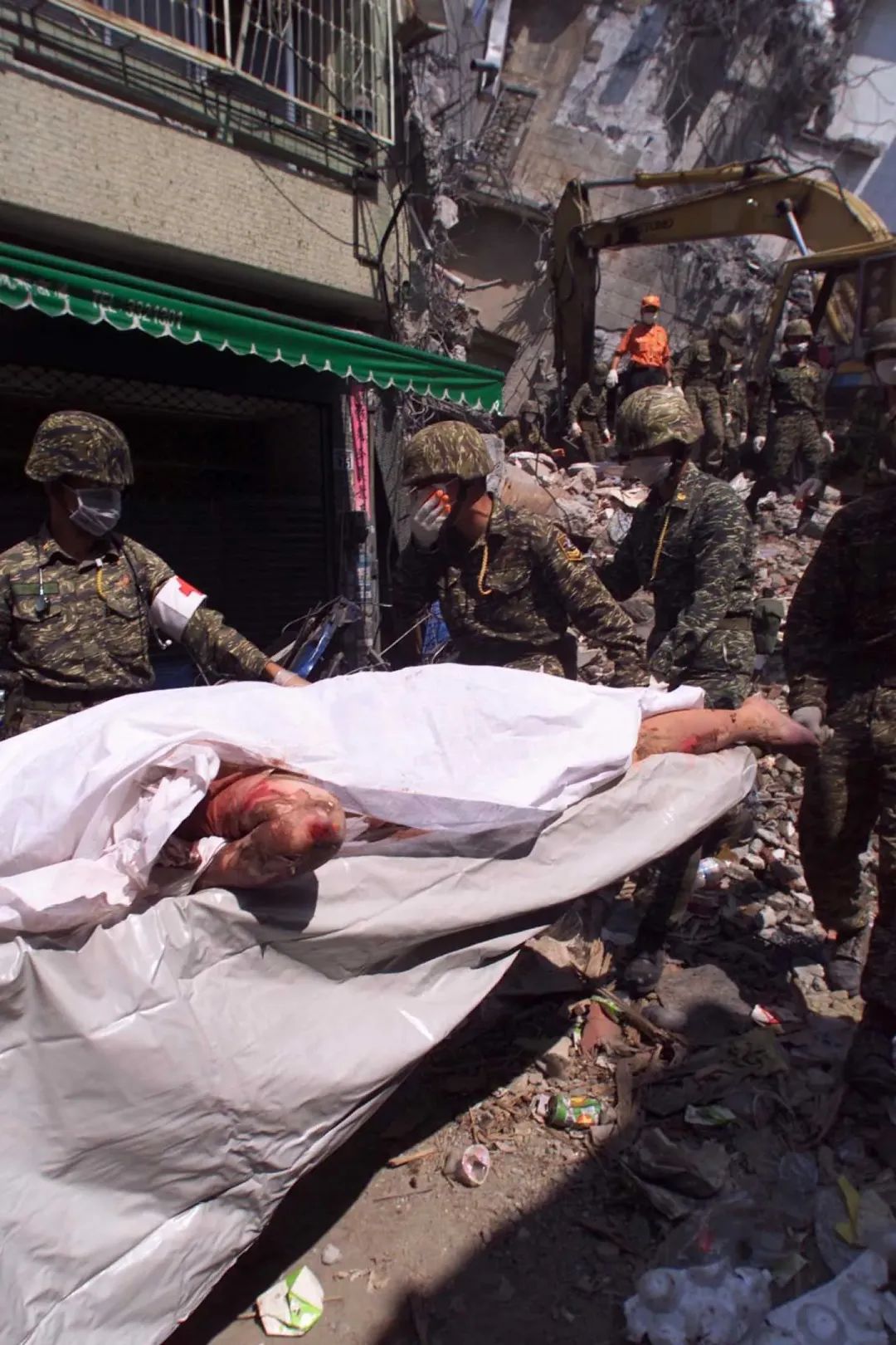 921震后,救援人员从倒塌的房屋中抬出遗体。图源:端