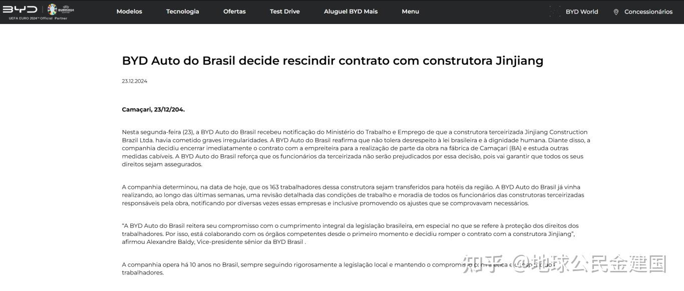 「比亚迪汽车巴西公司,接到劳动就业部通知,外包建筑公司金匠集团,犯下严重违规行为。