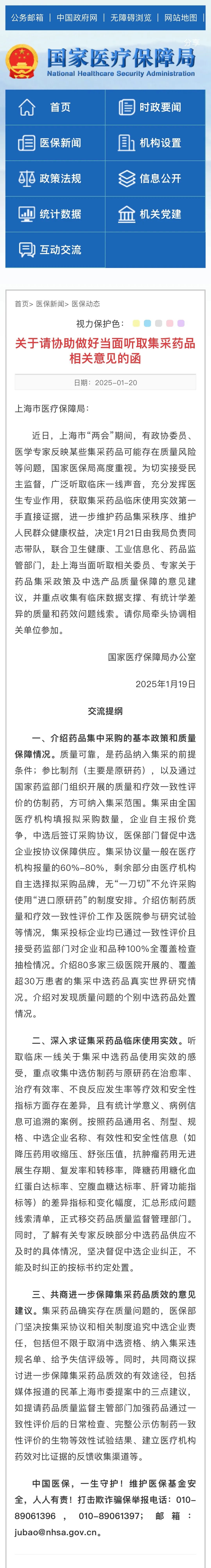 将于明日(1月21日)由国家医保局带队,联合卫生健康、工业信息化、药品监管部门,赴上海当面听取相关意见建议,并重点收集有临床数据支撑、有统计学差异的质量和药效问题线索。