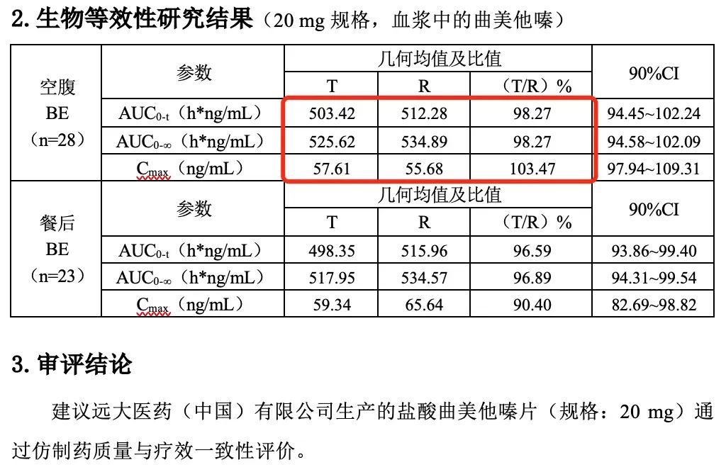 湖北四环制药和远大医药公司生产的两款盐酸曲美他嗪片20mg规格药品,在空腹状态下服用,代谢参数完全一致,也是精确到小数点后2位数都完全一致。然而,空腹服用表现完美一致的两种药,餐后服用的代谢参数却出现了显著差别。