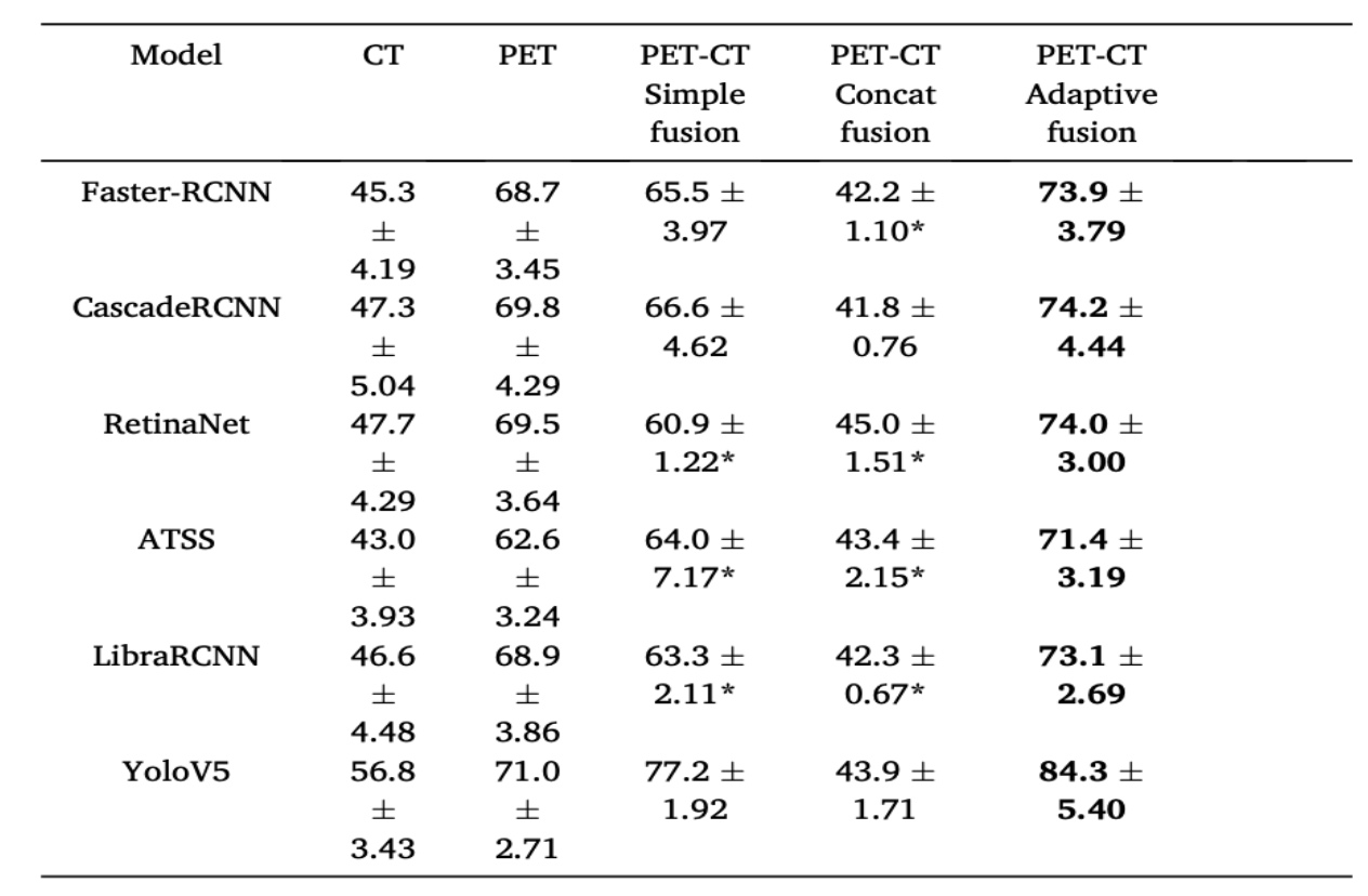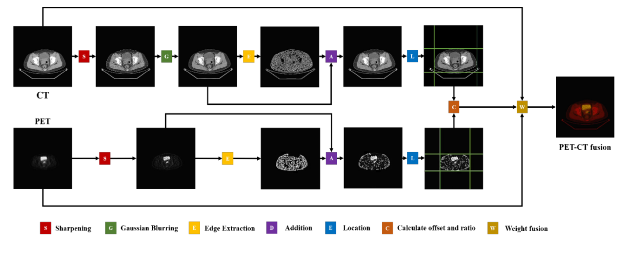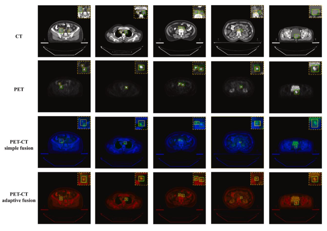fusion. The fused images were then concatenated on a channel-wise basis and fed into the object detection network for the precise segmentation of cervical cancer lesions. Compared to single modality images (either CT or PET) and alternative PET-CT fusion techniques,