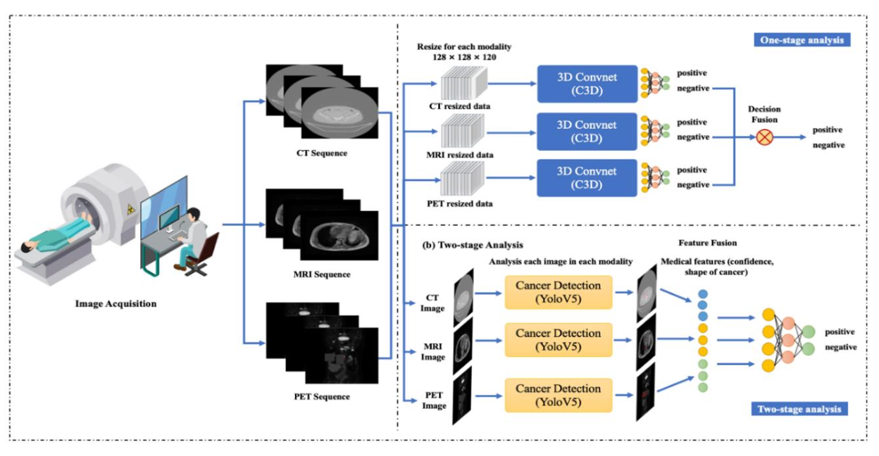 Compared to the traditional subjective image interpretation by clinicians, AI leverages deep neural networks to analyze large-scale imaging and diagnostic data, extracting valuable features for pathology diagnosis, and thus facilitating more accurate decision-making, underpinned by objective data. To emulate clinicians’ diagnostic process that integrates various imaging modalities like CT, MRI, and PET, a cross-modal deep learning methodology is employed. This approach synergistically merges features from different imaging modalities, capitalizing on their unique advantages to enhance model performance.