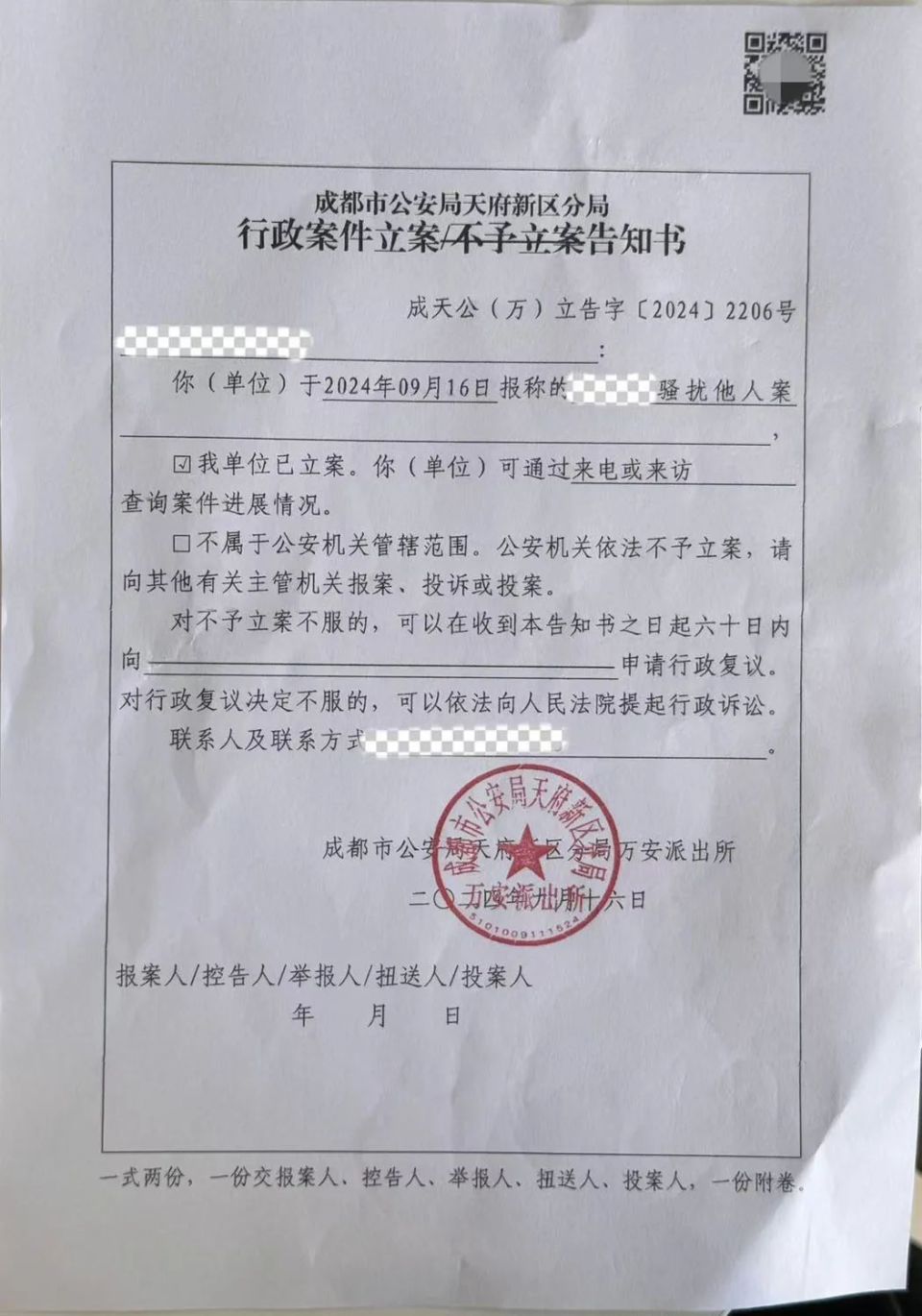 2024年9月16日,终于收到了Yuki和晴枫的行政立案告知书。