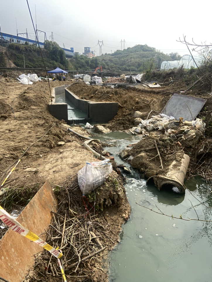 施工现场的排水沟,最终流入丫江。(图_晶朵/摄)