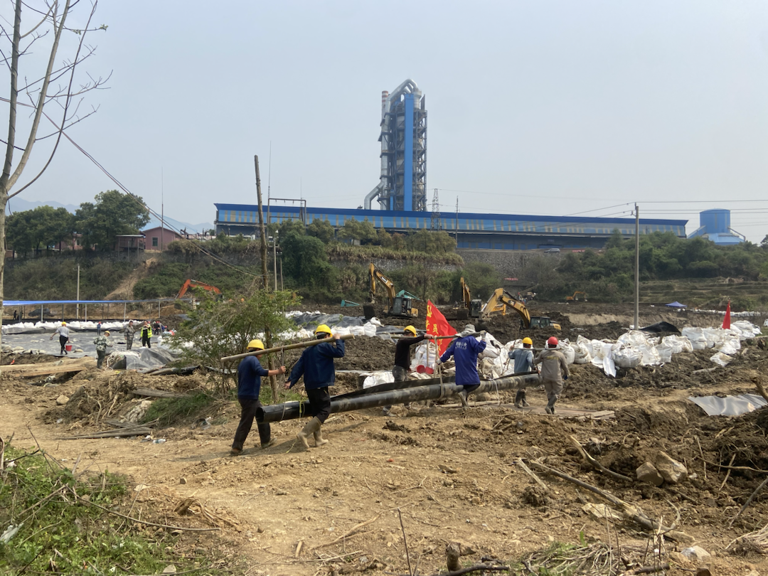 施工场地旁,水泥窑炉蓝灰醒目。银色大棚和农家水塘列于近侧,周边梯田层叠,或荒或绿。不远处山峦起伏,山体裸露。清浅的丫江从工地流经过后变浊,逐步转为浓稠的白色,在大片农田中蜿蜒。
