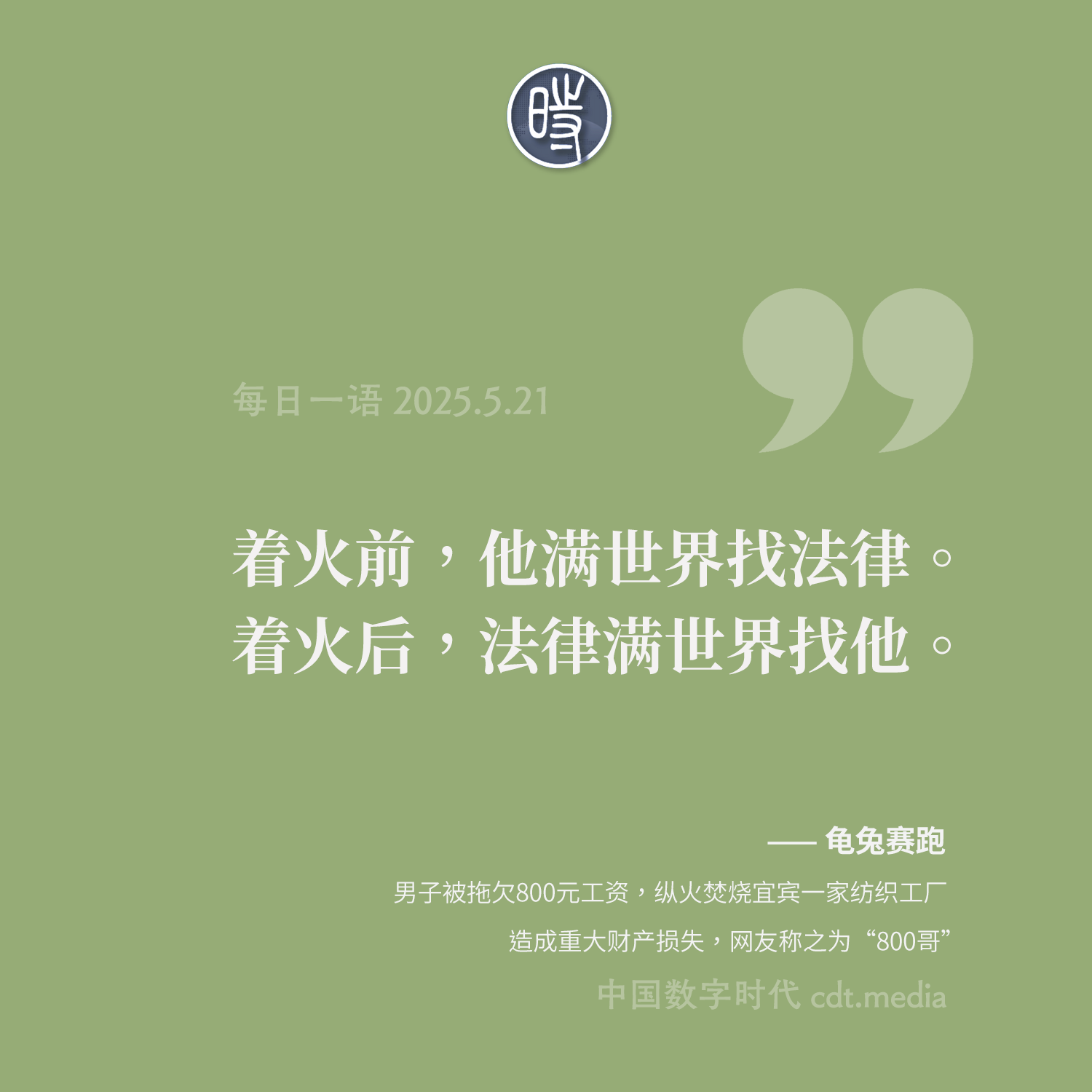 5月21日,网上又传出位于四川省宜宾市屏山县的锦裕纺织厂发生严重火灾,大火整整烧了37小时,隔天才扑灭,损失极为惨重。有人称,该厂的一名员工文某,因为800元薪资被长期拖欠,最终情绪失控,纵火焚烧工厂。还有人称,文某在纵火前曾与厂方人员发生了激烈争执,还说出了电影《哪吒2》的一句台词——“我活不活不重要,我只要你(厂长)死。”该事件引发网民热议,不少网友对于文某的“绝路反抗”深表同情,称之为“800哥”。有网友评论“着火前,他满世界找法律。着火后,法律满世界找他。”还有网友调侃需慎重考虑《哪吒2》不断延期,以免引发现实中的模仿效应。甚至有人替“800哥”写下这样一句话:“我走后,他们会给你发工资,不是因为他们善良,而是因为我来过。”总之,一个显而易见的事实是,当被欠薪者求助时,整个制度都失能了,最终老板赢了,保住了800元但失去了整个厂。