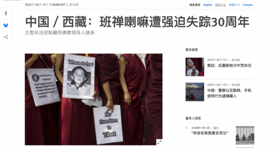 一、人权观察呼吁中国政府释放遭强迫失踪的十一世班禅
