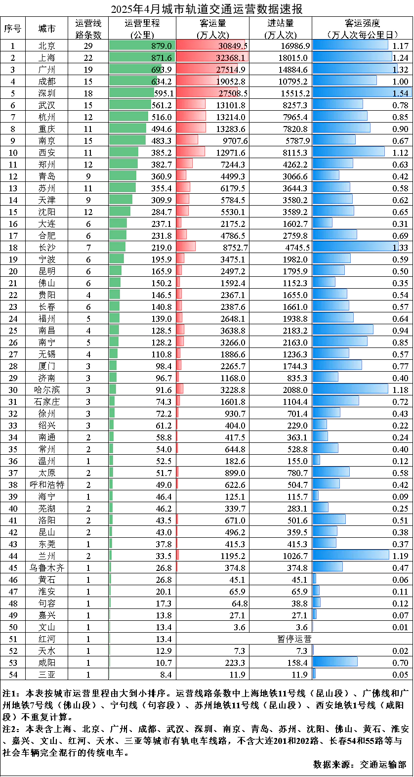 在所有城市中,只有9座城市客流强度超过1万人次/公里日:深圳、长沙、广州、上海、兰州、哈尔滨、北京、西安、成都。