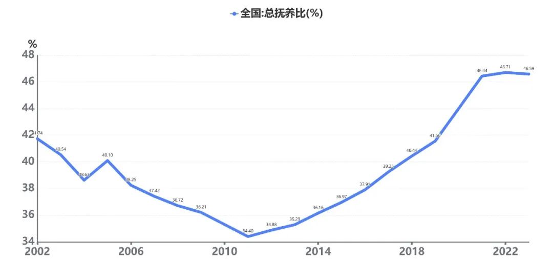 2021年开始,我国的总抚养比达到47%,并且连续3年保持在高位水平。