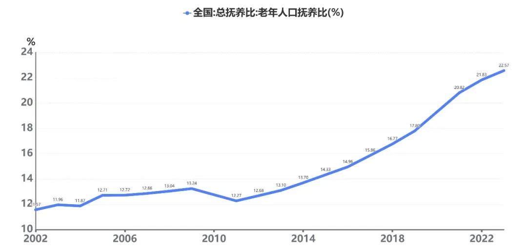 但是,老人抚养负担增加显著。2011年老年人口抚养比仅为12%,2023年达到23%。抚养负担翻倍。