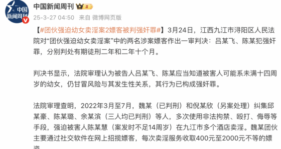 中国新闻周刊:【#团伙强迫幼女卖淫案2嫖客被判强奸罪#】3月24日,江西九江市浔阳区人民法院对“团伙强迫幼女卖淫案”中的两名涉案嫖客作出一审判决:吕某飞、陈某犯强奸罪,分别判处有期徒刑二年和二年十个月。