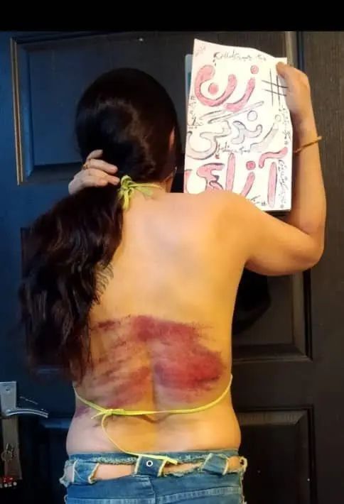 照片中,女子手持“妇女、生命”的纸牌表示抗议,她的背部伤痕累累;视频中,她身上的伤痕更加明显,胸前和双腿有严重淤青,呈紫红色。