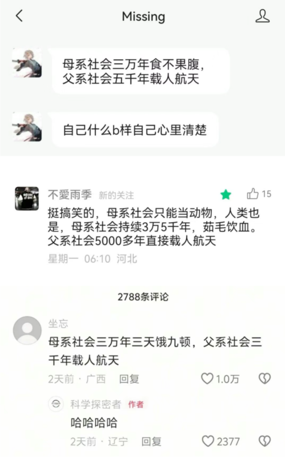 然而,很多姐妹对此的反驳其实并未足够有力。例如回应什么“吃了五个馒头饱了,说功劳都是第五个馒头的,前面四个没用”。这种回复实际上并没有切中肯絮,也很失气势。最根本的原因在于,这种回应错误地预设了载人航天等科技进步的确是拳社会取得的成就,只不过觉得也不能把母系社会说得一无是处而已。甚至,这种观点里还隐含了“母系在给父系铺路打基础”“父系的确更为先进”等潜台词,反而在褒扬和肯定了拳社会。