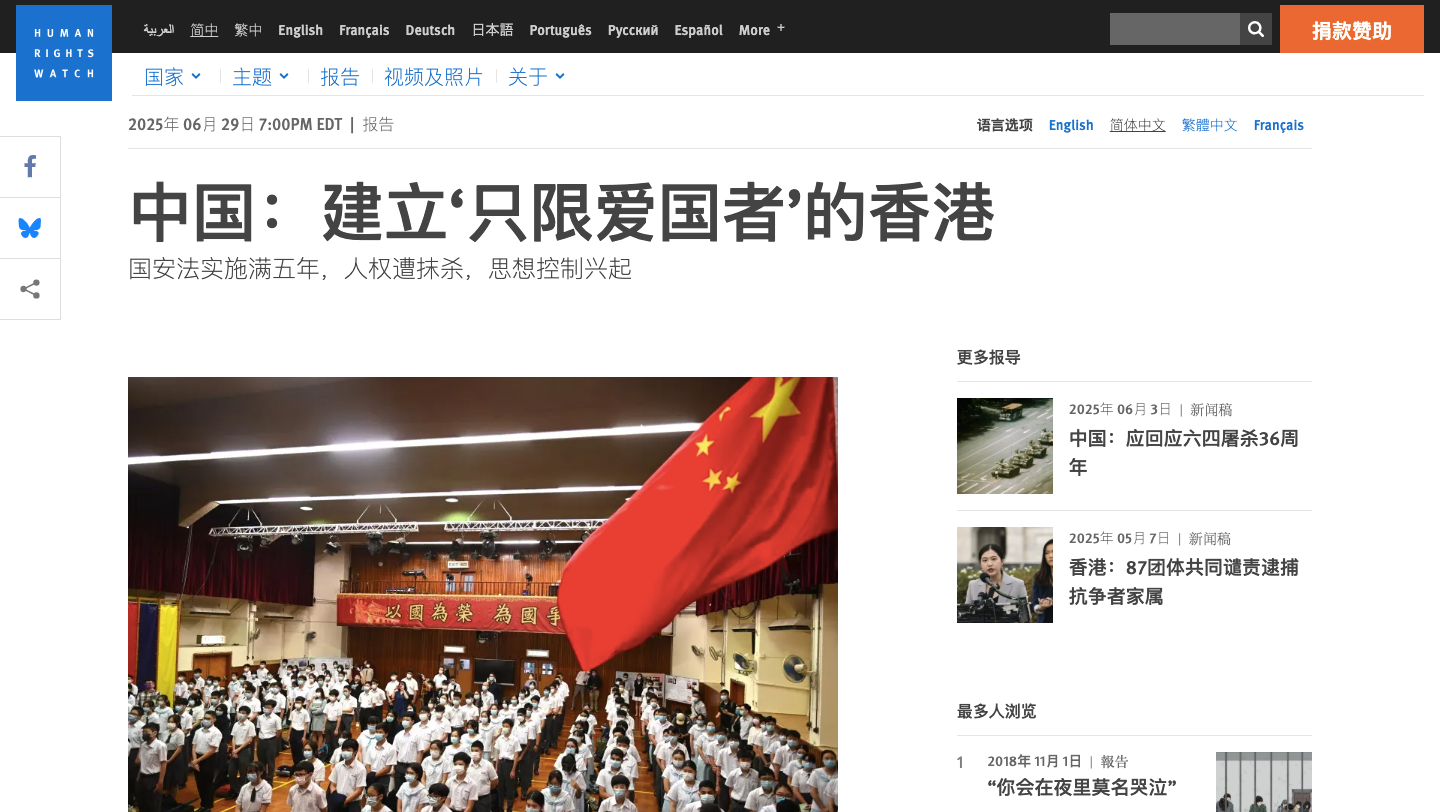 二、人权观察:港版国安法五周年,港府打压人权、洗脑民众