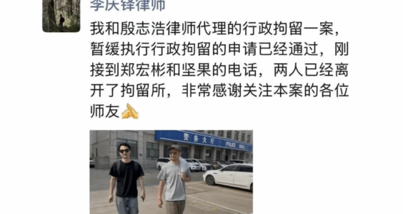 据代理二人的律师的分享可知,关于坚果兄弟和郑宏彬的暂缓执行行政拘留的申请通过,两人被放出,已经离开陕西榆林拘留所。