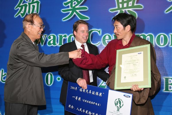 人物介绍:仁青桑珠,2005年获得第一届“阿拉善生态奖”的“胡杨奖”,2006年度获“福特汽车环保奖”自然环境保护类一等奖。2003年,在他的带领下,西藏昌都贡觉县相皮乡孜荣河谷,以东巴村为核心的11个藏族村落,共同成立了康区安琼森格南宗生态环境保护自愿协会,致力于当地的生态环境恢复和保护工作,植树种草、捡垃圾,共同保护家乡的环境。