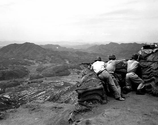 Associated Press 1950年6月25日:金日成领导的朝鲜民主主义人民共和国向大韩民国发动突然进攻。得到苏联援助的朝鲜军队装备了坦克和重型火炮。联合国呼吁交战双方停火。图为韩国士兵在阵地抵抗朝鲜军队的进攻。 Associated Press 1950年6月28日:美军赶在朝鲜军队攻占汉城(今首尔)之前组织了紧急疏散。图为一队美军在向汉城以西的一座机场撤退。 Associated Press 1950年7月:为了延缓朝鲜部队的行进,美军战机炸毁了汉江上的铁路桥。 National Archives/Associated Press 1950年7月:这张照片曾被列为最高机密。大批韩国政治犯在大田被屠杀。一名美国陆军上校说,韩国政府害怕国内左翼势力叛变通敌,故将他们残忍杀害。 Associated Press 1950年9月29日:美军在9月28日成功实施仁川登陆作战,一举收复汉城。次日,麦克阿瑟将军(图左)和时任韩国总统李承晚返回汉城。 Max Desfor/Associated Press 1950年10月:联合国军在平壤向一条疑有朝鲜共军把守的铁路隧道开火。在联合国军占领平壤的同时,中国志愿军开始赴朝鲜参战。 Henry Griffin/Associated Press 1950年11月30日:美国总统杜鲁门警告朝鲜,他说联合国军不会放弃他们在朝鲜的使命,并表示必要情况下会使用原子弹。 Associated Press 1951年7月10日:照片中从左到右分别是当时的美国海军司令阿利•伯克(Arleigh Burke)将军、亨利•赫德斯(Henry Hodes)少将和L.C. 克雷吉(L.C